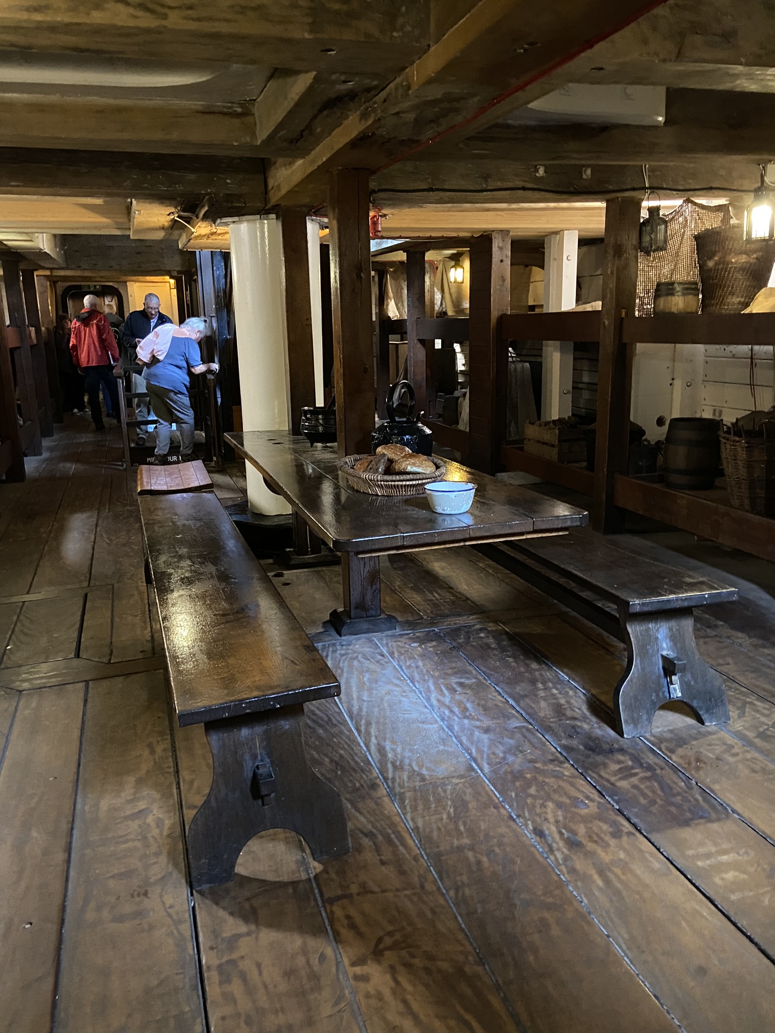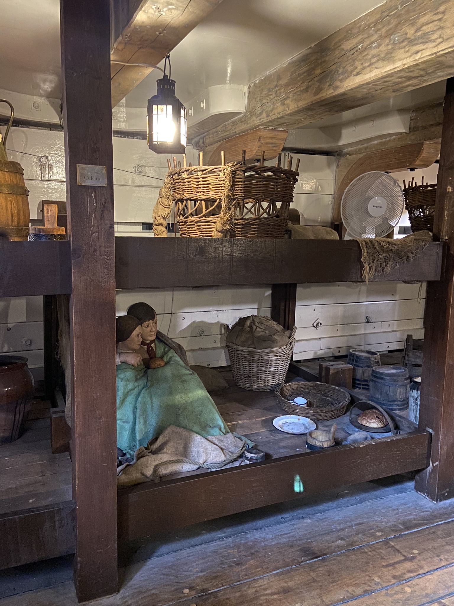 Photos from the Dunbrody show the six-by-six foot bunks, that allowed 18 inches for each person. The top bunk might have been two and a half feet high, allowing three and a half feet for the lower. Ceilings were six feet high. There were tables with benches in the middle the passengers used for eating and all activities. Passengers were expected to bring their bedding with straw being preferred – easier to throw out later. There were advantages to claiming a berth in the middle of the ship near a hatchway. (4)