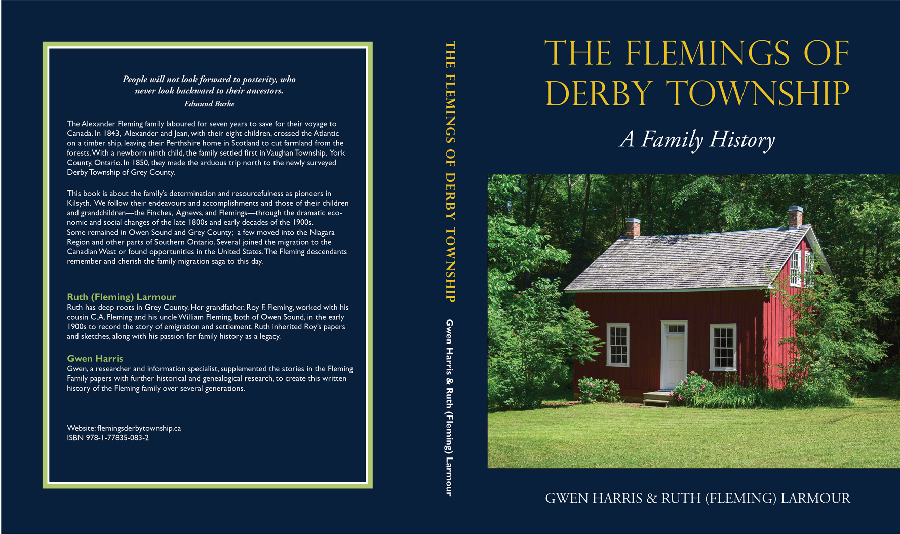 It’s here! After many years of research by Ruth Larmour and Gwen Harris, much transcribing of original documents, countless hours building the family tree in Ancestry, much fact-checking, many interviews with descendants, many searches through land records, newspapers, directories, and other archives, much reference to written histories, the long-awaited Flemings of Derby Township: A family history has been printed.